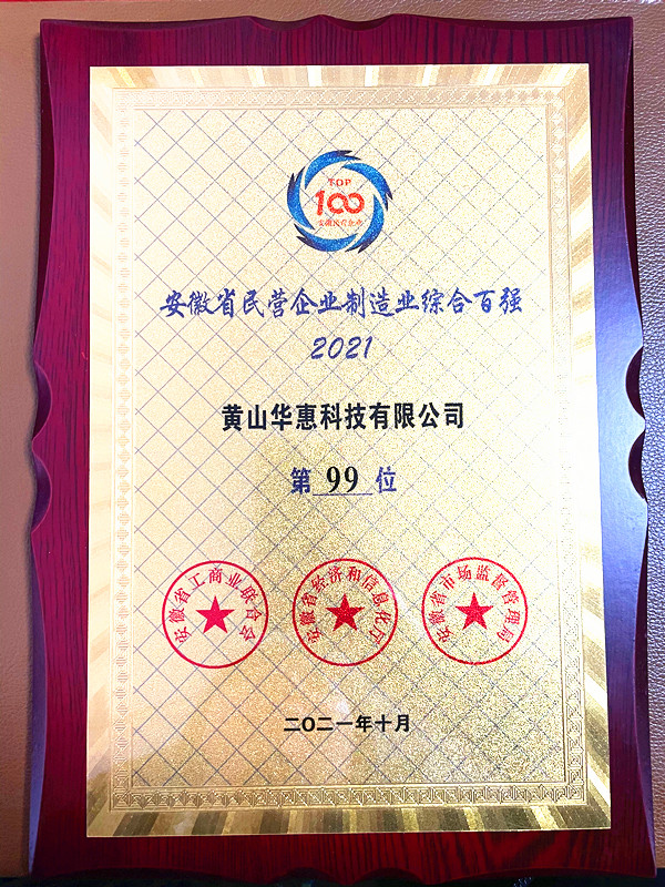 近日,2021安徽省民營企業(yè)百強發(fā)布會暨百強民營企業(yè)走進阜陽活動在阜陽市舉行,會上公布了2021年安徽省民營企業(yè)百強榜單。華惠公司位列2021年安徽省民營企業(yè)制造業(yè)綜合百強第99位。